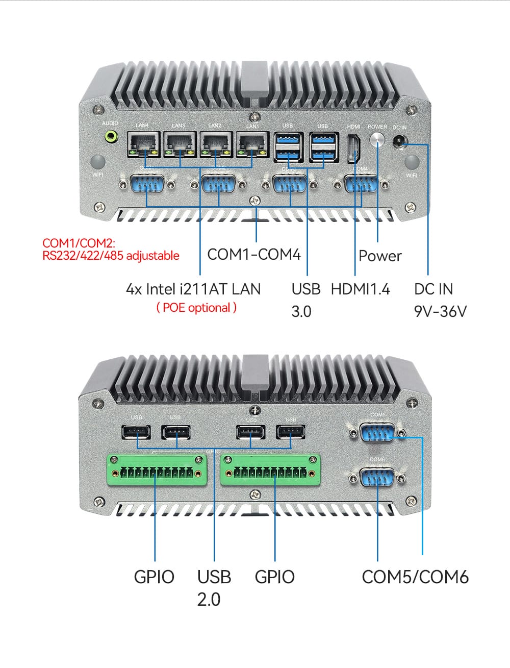 Com1 com2: RS232, RS422, RS485 có thể điều chỉnh