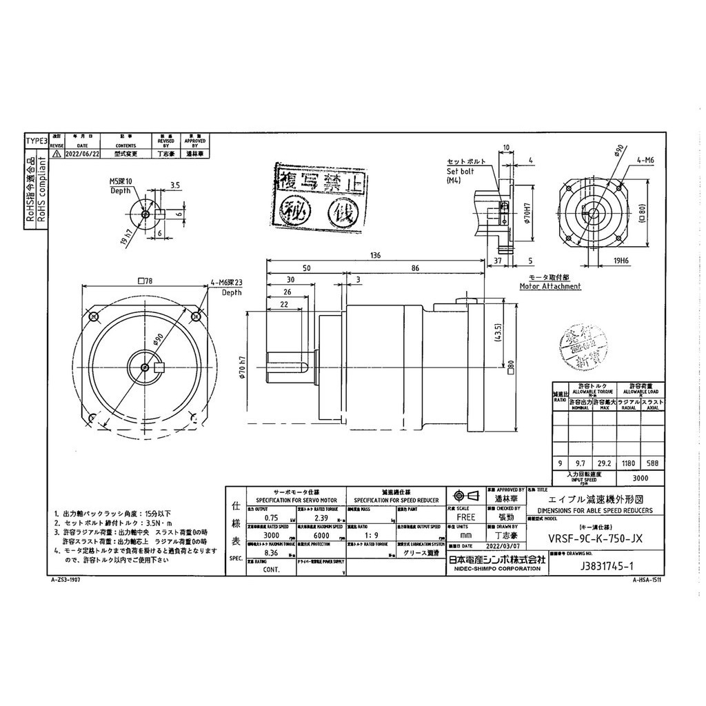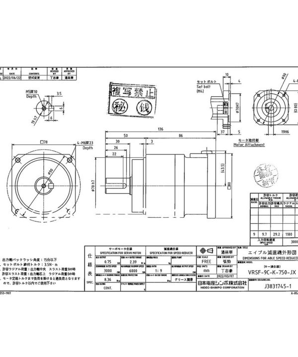 VRSF-9C-750 Mới Của Nhật Bản Hộp Số Giảm Tốc Hành Tinh Nidec Có Độ Chính Xác Cao Với Tỷ Lệ Tốc Độ 750 Watt 9