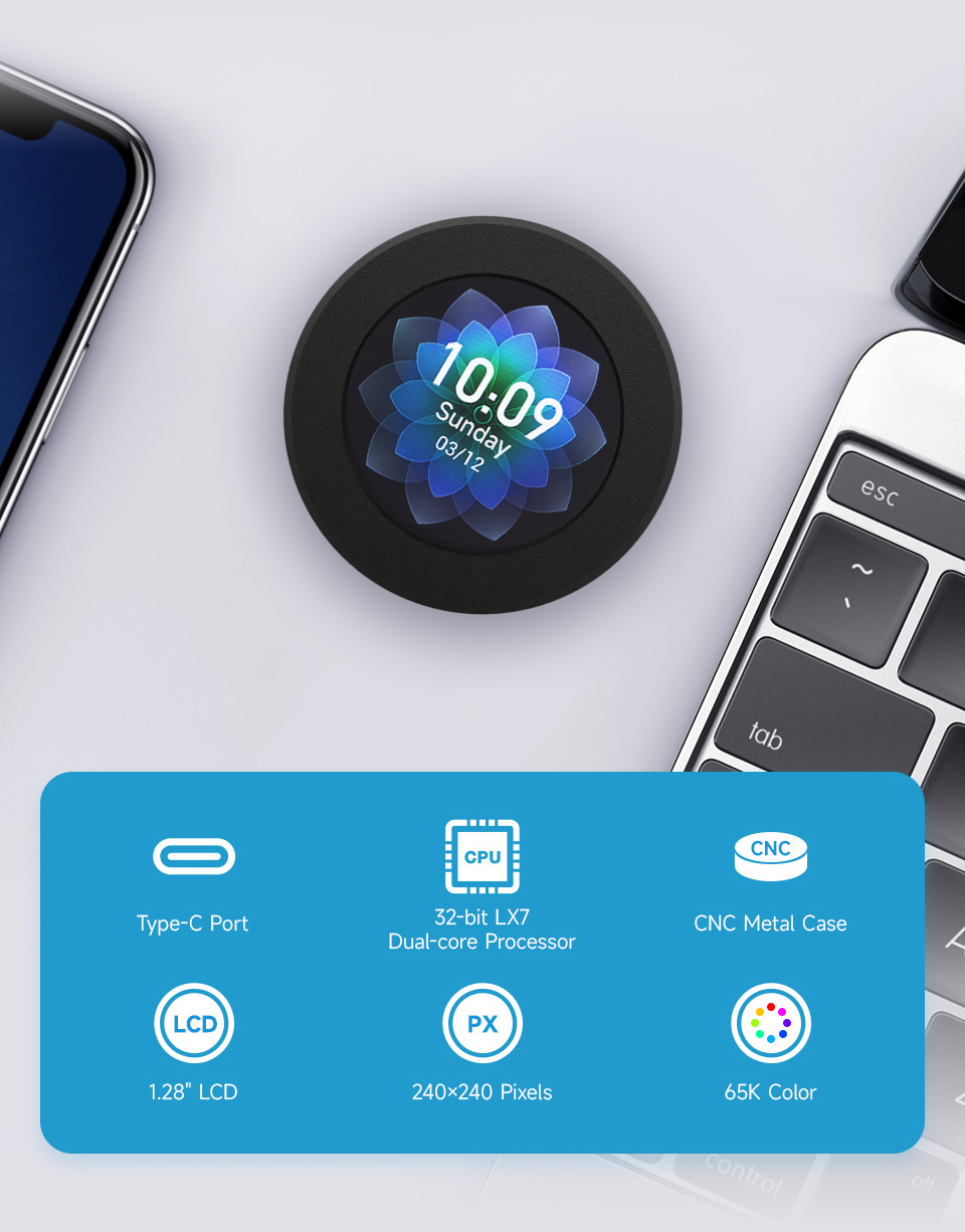 Waveshare ESP32-S3 ban phát triển, 32-bit LX7 Dual-core Bộ vi xử lý, với 1.28inch IPS Vòng LCD, hỗ trợ Wifi/Bluetooth