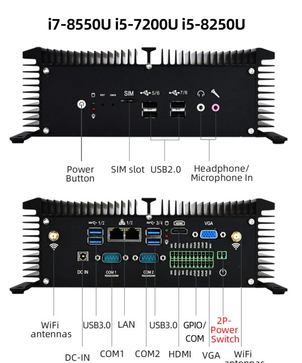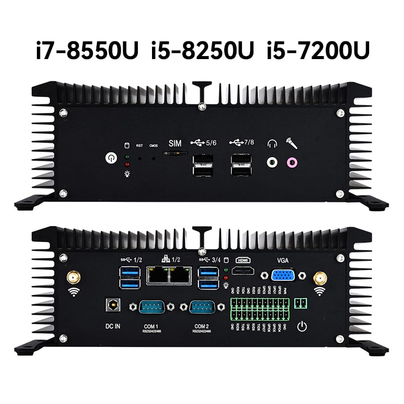 Xcy máy tính PC mini công nghiệp fanless I7 8550u i5 8250u 6x RS232 RS485 2X Lan GPIO HDMI VGA 8X USB hỗ trợ wifi 4G LTE Windows Linux